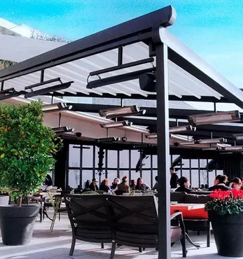 Permite añadir toldos de caída vertical para crear cerramientos adaptables en espacios exteriores.